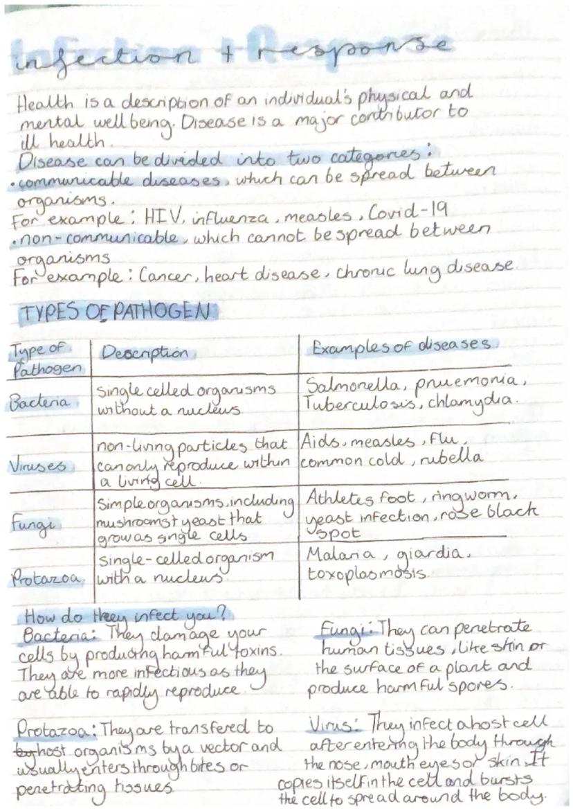 Explore the biology of infectious diseases, including pathogens, immune responses, and disease prevention strategies. This summary covers key concepts such as the role of white blood cells, the mechanisms of disease transmission, and specific diseases like HIV, malaria, and salmonella. Ideal for AQA GCSE Biology students preparing for exams.