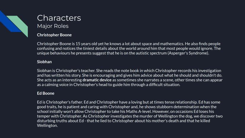 The opening page introduces "The Curious Incident of the Dog in the Night-Time" with credits to Aoife, Lia, and Tom as contributors to this analysis.