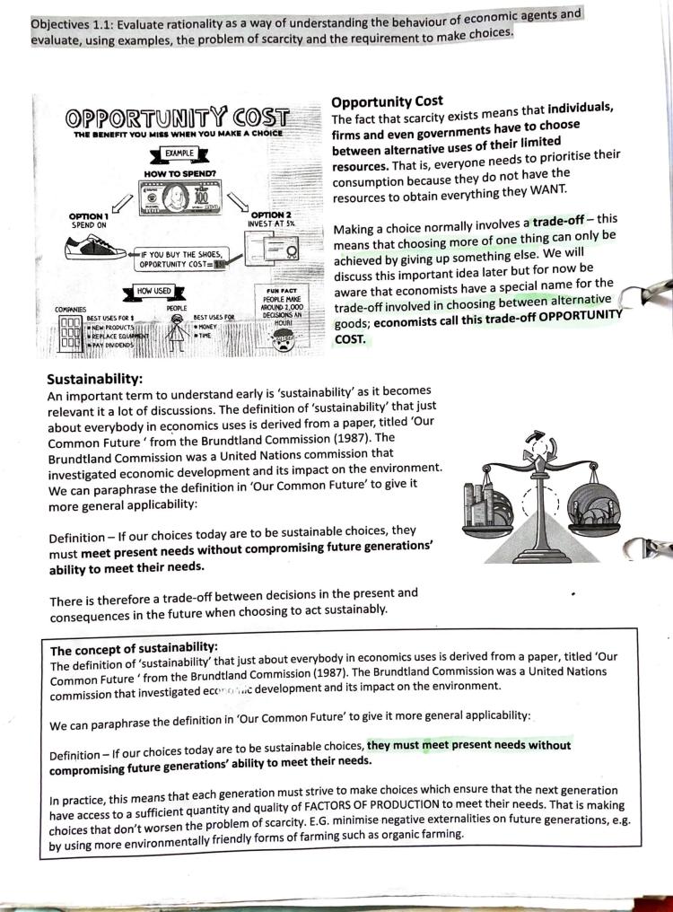 The page concludes by reiterating the concept of scarcity and its implications for economic decision-making by consumers, businesses, and governments.