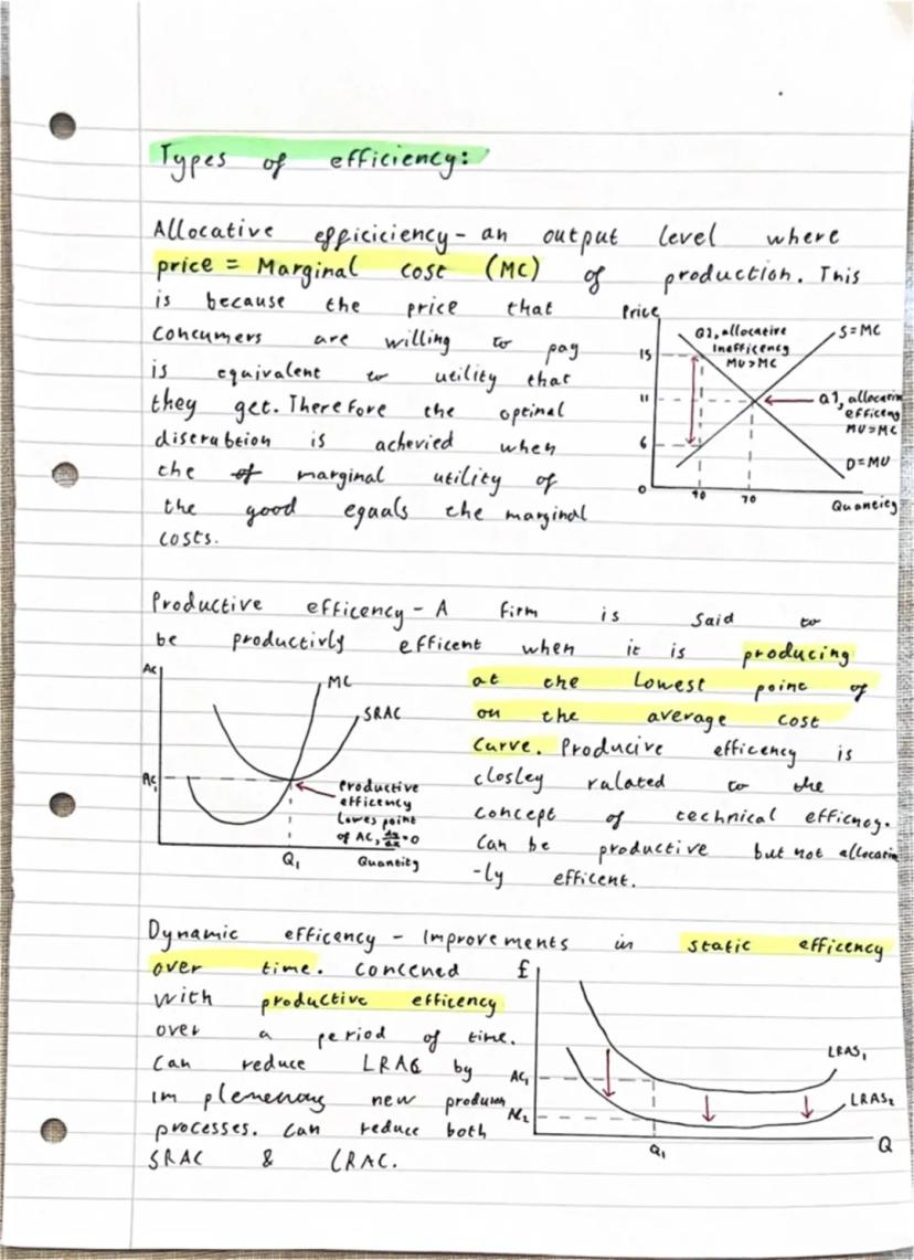 Highlight: Productive efficiency is achieved at the lowest point of the Average Cost (AC) curve, where firms produce at minimum average cost.