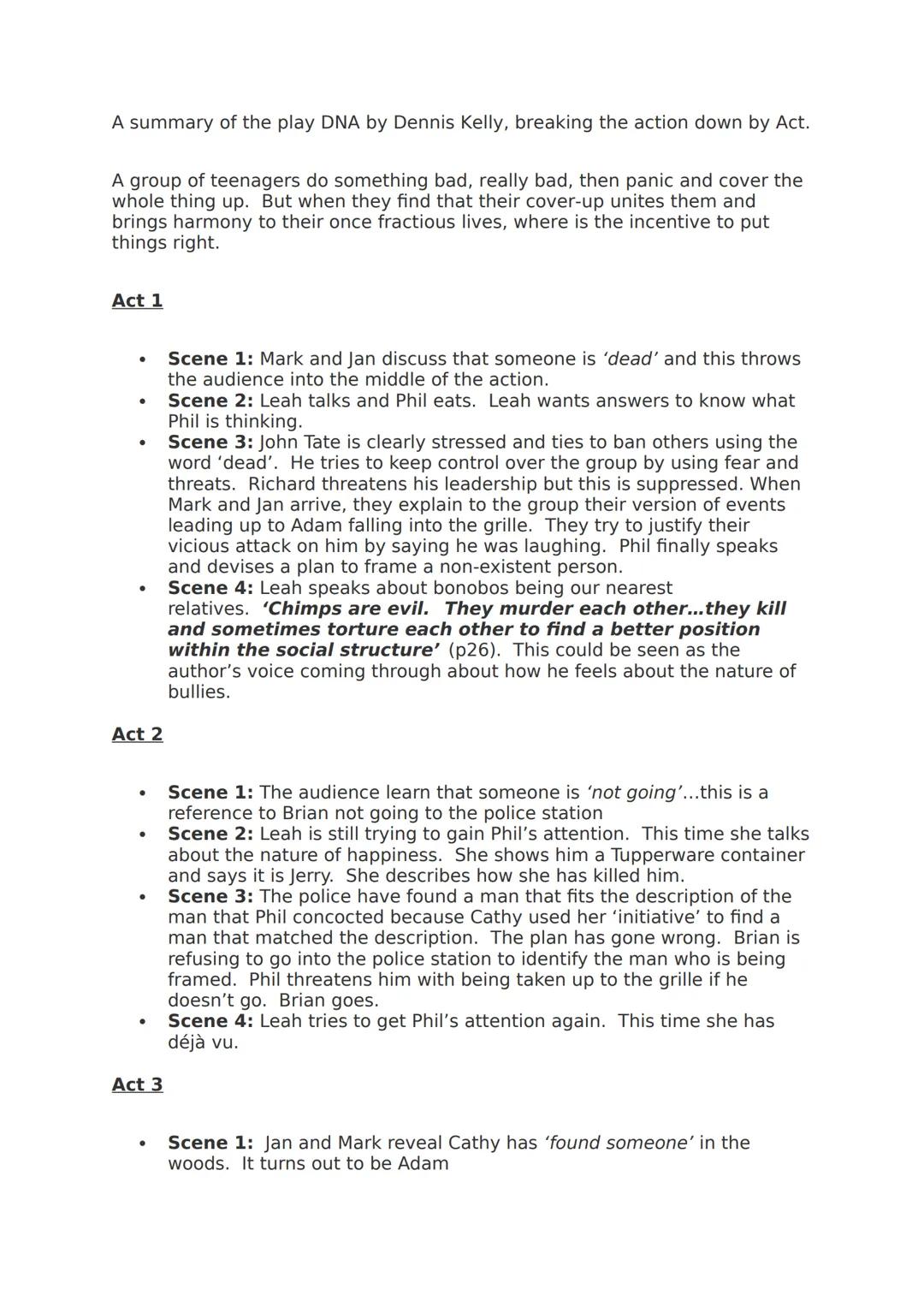 DNA by Dennis Kelly is a gripping play that explores the dark consequences of group dynamics and moral choices among teenagers. This DNA play summary GCSE revision PDFprovides a comprehensive overview of the plot, characters, and themes, making it... Show more