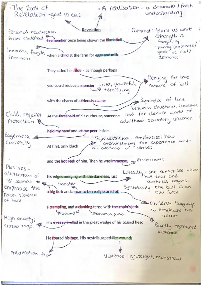 The third page of Liz Lochhead's "Revelation" delves deeper into the symbolism and contrasts present in the poem. The black bull is presented as a powerful symbol of evil and danger, contrasting sharply with the innocence and naivety of the child and the surrounding farm environment.