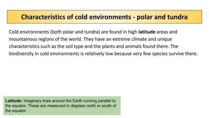 The characteristics of cold environments are defined by extreme conditions that shape unique ecosystems. In the tundra, temperatures typically range between -12°C and -6°C, with a brief 50-60 day summer period of constant daylight. The defining feature is permafrost - permanently frozen ground that can extend 450 meters deep, though surface layers may thaw seasonally in southern regions.