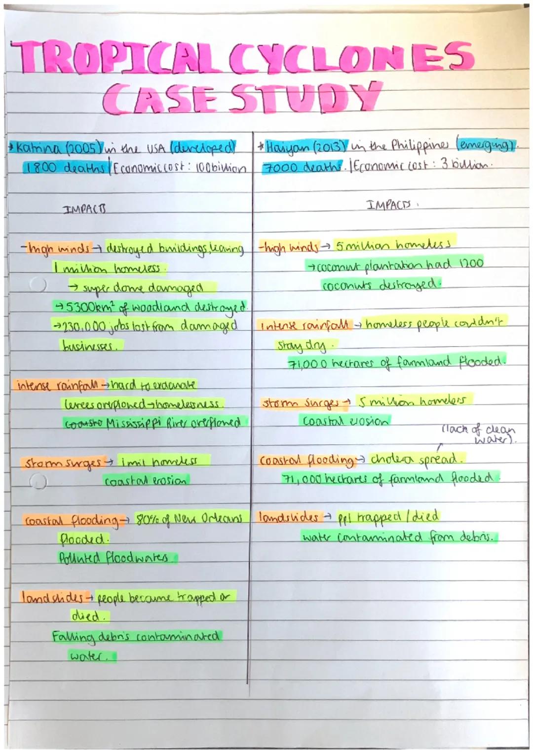 The first page details the devastating impacts of Hurricane Katrina and Typhoon Haiyan across multiple dimensions. Where did Hurricane Katrina hit and its impacts are thoroughly documented, alongside the destruction caused by Typhoon Haiyan in the Philippines.