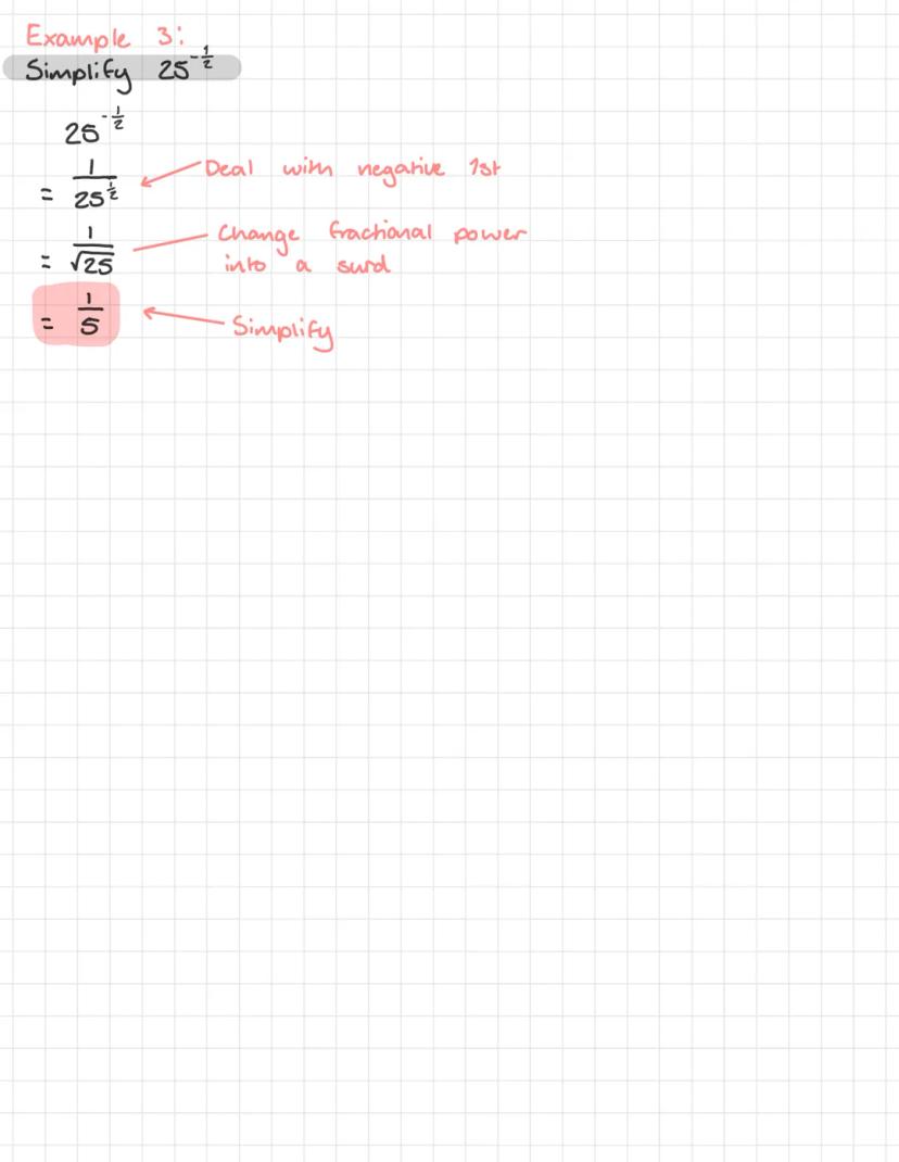 The page presents an example of simplifying 25^(-1/2). This problem combines negative and fractional powers, requiring a step-by-step approach:
