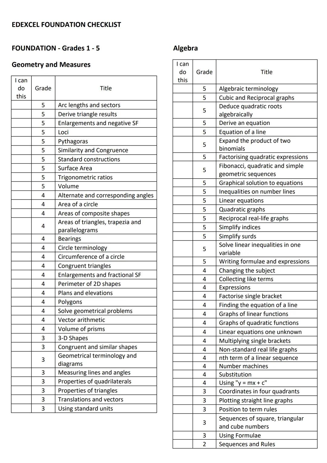 The GCSE Maths topics list Edexcel Higher and GCSE maths topics list edexcel higher pdfprovide a comprehensive breakdown of mathematical concepts for Foundation level students aiming for grades 1-5. This detailed checklist covers six main areas: Geometry and Measures,... Show more