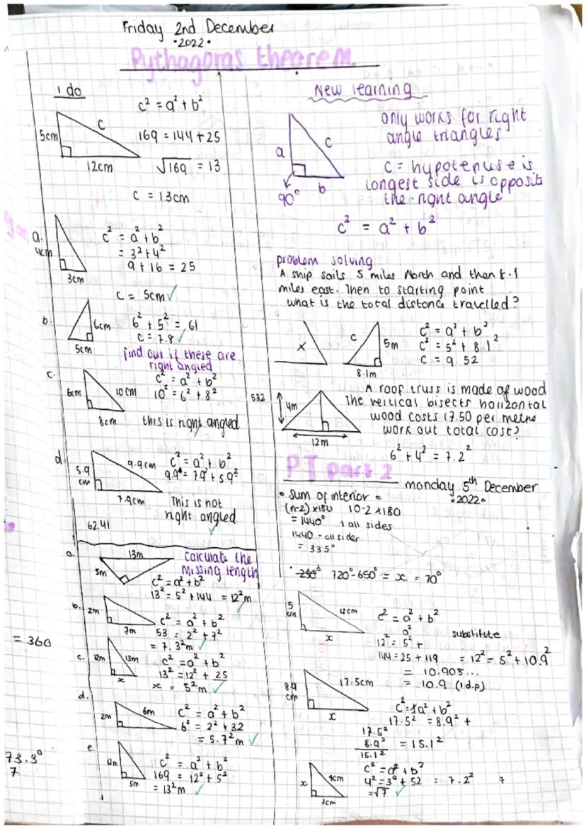 - Using the Pythagorean theorem to find missing sides in right-angled triangles.