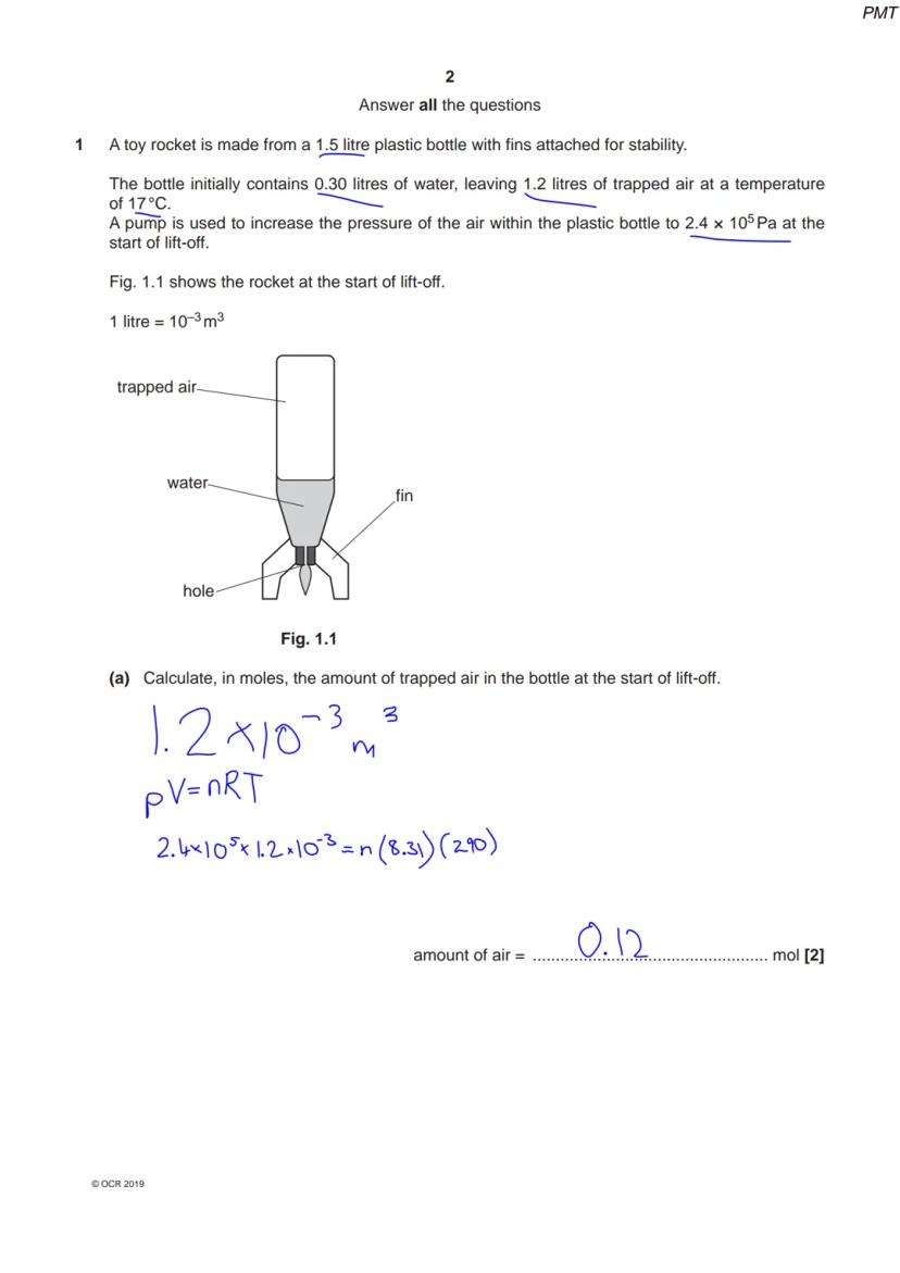 The OCR A Level Physics unified exam June 2019 explores key physics concepts through practical applications like toy rockets and trapped air calculations.